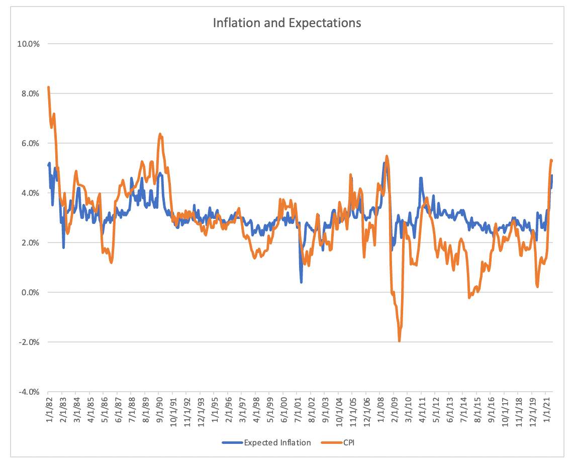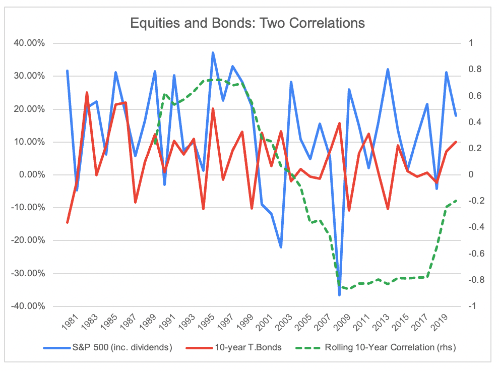 And this, as it turns out, has an important connection to the equity/bond correlation. One way to look at equities versus bonds is a pure risk-on versus risk-off trade: if you expect to make money, you buy stocks, and if you expect to lose money, you stash it in bonds. That's approximately true, unless the big risk to your capital appreciation comes from inflation, in which case rates stay high and both bonds and stocks underperform. If central banks can change interest rates in response to a slowing economy, it naturally makes bonds correlate inversely with stocks—bonds are more rates-sensitive, all else being equal, but all else is only equal if inflation is not a material risk.