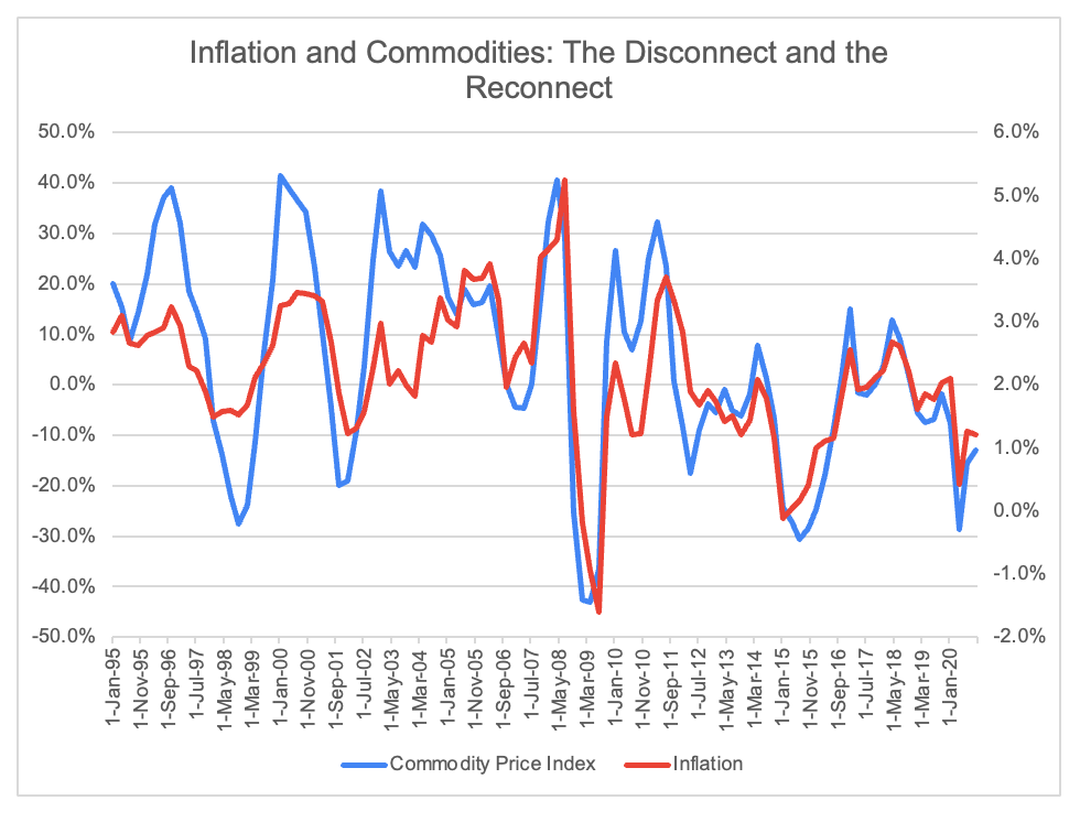 It also had a paradoxical effect on one major mechanism for inflation. In theory, an increase in the price of raw commodities should eventually make its way to consumer products; over time, companies will find a way to pass on those costs, rather than absorb them. And in immediate terms, that's true: commodity price spikes lead to higher CPI readings, especially as energy costs either flow through directly (at the gas pump) or indirectly (through the cost of making or delivering just about anything). But something interesting happened in the 90s and early 2000s: commodities price spikes didn't get passed through to consumers. An old macro hedge fund letter I came across hypothesized that China was the reason for this disconnect: in a steady-state economy, raw materials are used to build a bit more capital that's a complement to existing labor, or to increase output (which uses more of that labor's hours). But in the 90s and especially the 2000s, the purpose of the marginal ton of iron or copper was to build things in China, where they were a complement to a large and cheap labor force. So higher commodities prices actually meant lower consumer prices, since the higher cost of components was offset by the lower cost of the people who turned those components into finished goods.