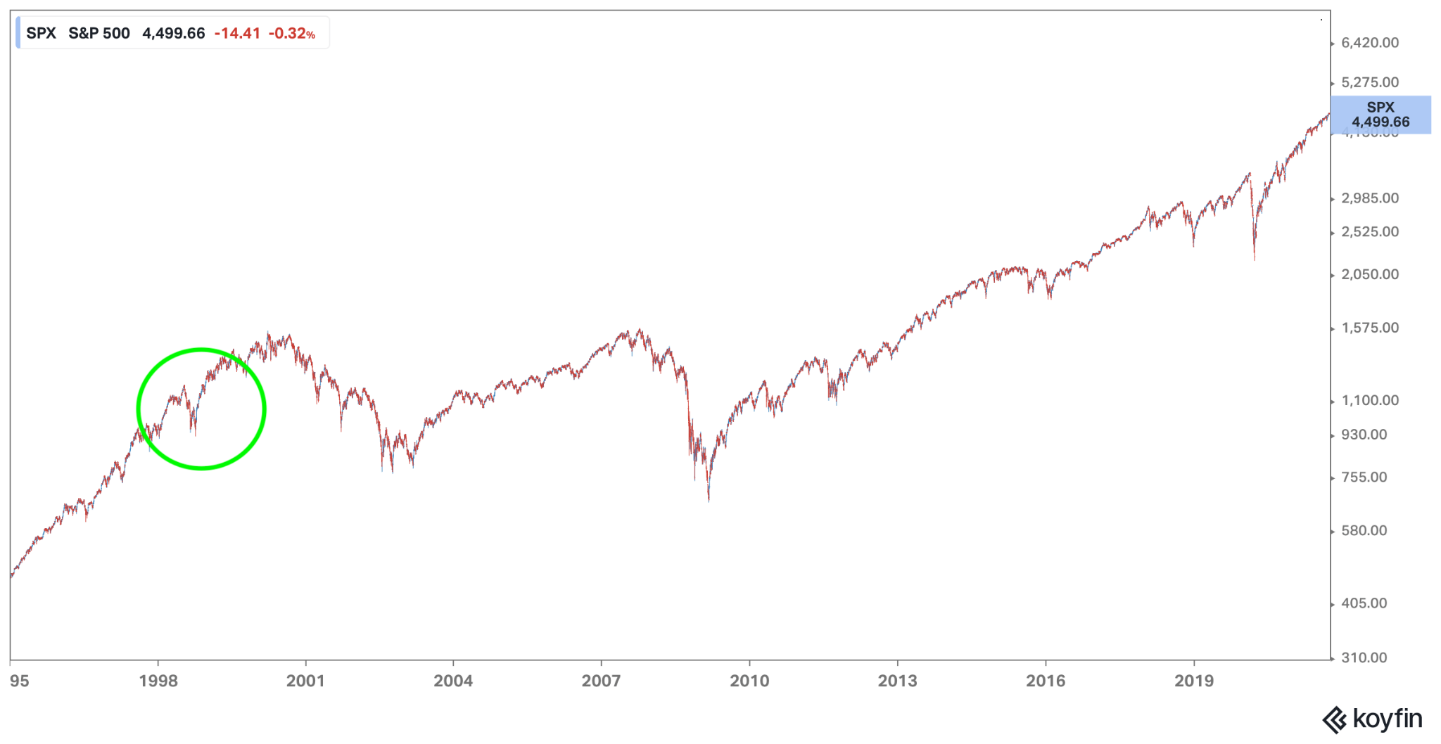 This is a two-and-a-half-decade chart of the S&P 500. The three huge bear markets of 2000-2, 2007-9, and a few weeks of 2020 are clearly visible. But the point I've circled in 1998, which was a time when the rules definitively changed. When I started paying attention to the market in the early 2000s, there were several rules that were pretty widely assumed to be accurate: