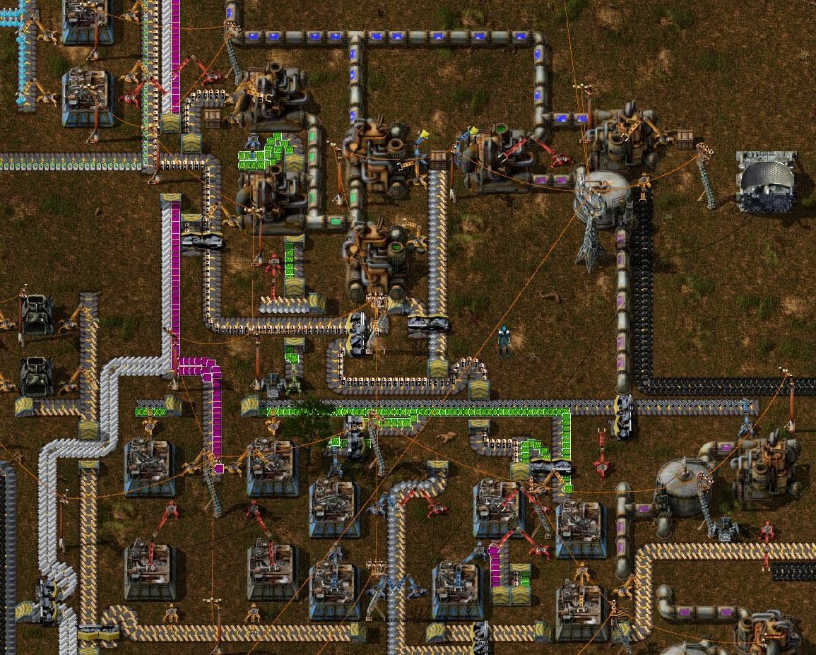 The traditional programming term for solving this kind of problem is “refactoring,” when you take a big messy blob of code that has evolved over time, write down what it is actually supposed to do, and rewrite something that does exactly that.1 Factorio involves a lot of this (it should probably be renamed "Refactorio"). The player is basically building a giant mesh of in-game APIs (“plug in here to get steel bars, plug in there to get green circuits”), getting those APIs to 100% reliability, and then building something on top of them and getting that to perfect reliability, all while managing scarce resources and dealing with random failures.2