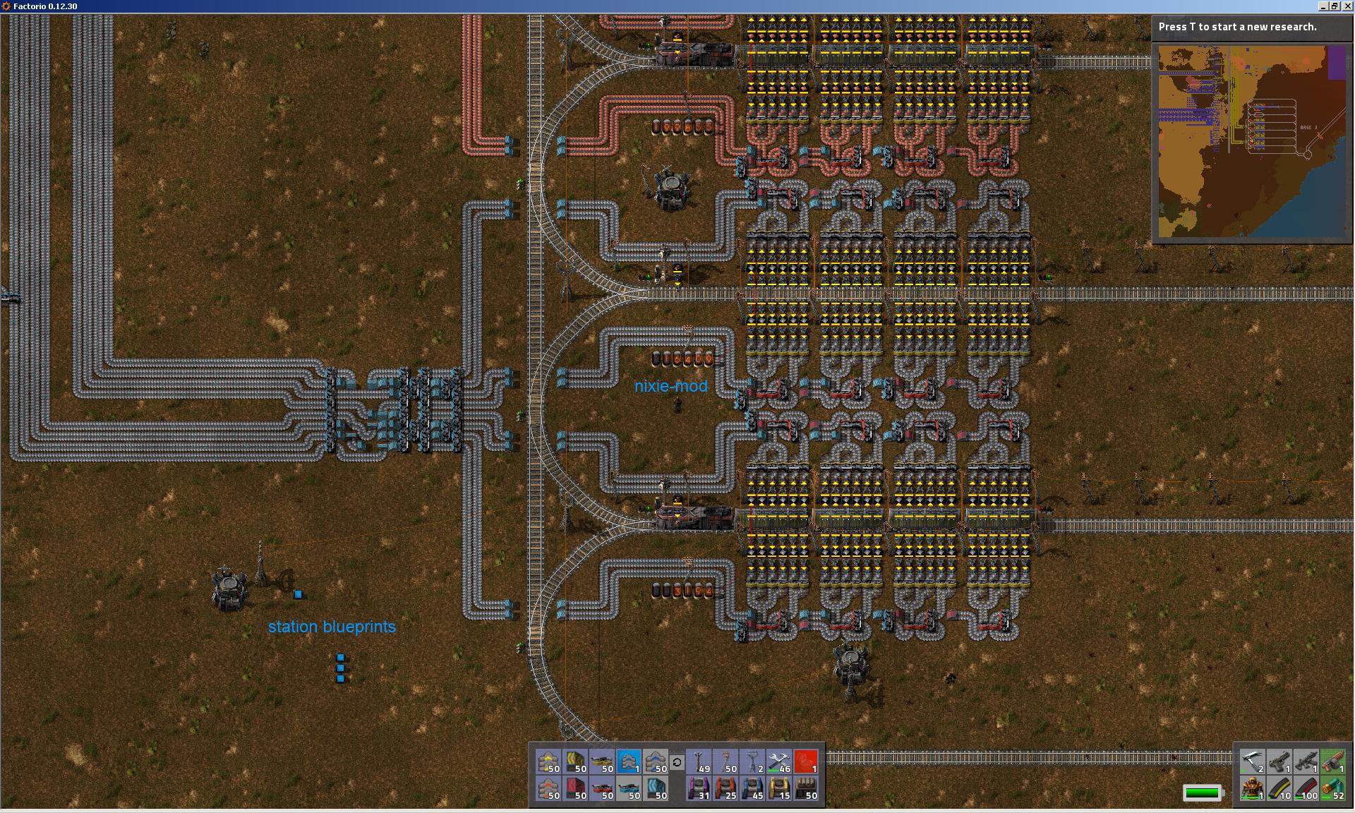 Why not design it right from the beginning? For two reasons, relatable both to programmers and Factorio players. The first reason is that you don’t necessarily know what your end goal will be when you start, and it’s better to build something that makes incremental progress than to spend a bunch of time idly speculating about the end state. The second, related reason is that the resources needed to build the perfectly-designed base are not available upfront, and can be acquired inefficiently through a sort of rough-draft base. In CS terms, expanding a poorly-specced and unmaintainable Factorio base is O(log(n)) while expanding a perfectly specced one is O(n), but the coefficient on the first is massively higher. ↩